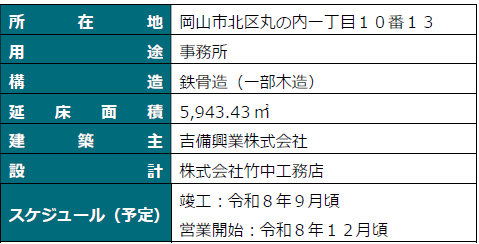 ちゅうぎんフィナンシャルグループ(岡山市北区丸の内一丁目15番20号 社長 加藤 貞則)と子会社である株式会社Cキューブ・コンサルティング(岡山市北区本町2番5号ちゅうぎん駅前ビル4階 代表取締役 西原 立)では、吉備興業株式会社(岡山市北区丸の内2-10-17 吉備興業ビル2F 代表取締役 谷口 晋一)が建築主である環境配慮型オフィスビル(令和8年9月竣工予定)の「建築物LCA※1」を算定いたしましたのでお知らせします。