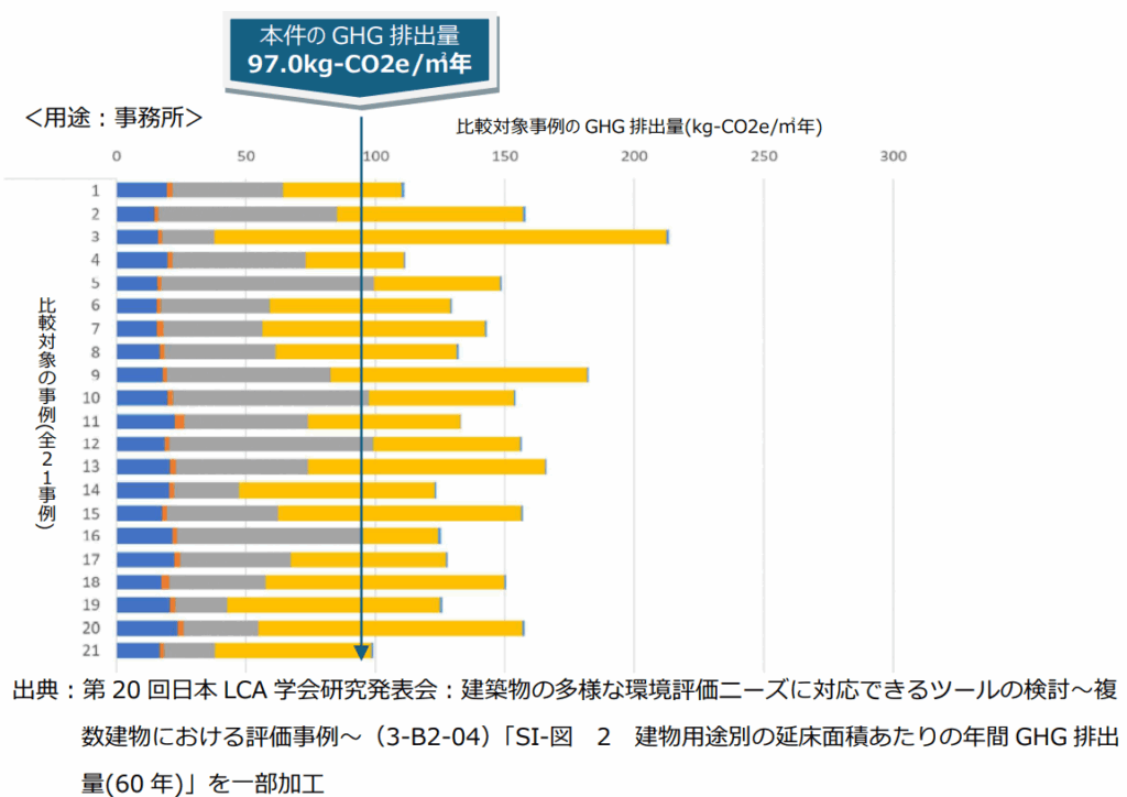 株式会社Cキューブ・コンサルティングによる算定の結果、当該ビルのGHG排出量は「97.0kg-CO2e/㎡年」となり、日本LCA学会が算定した事務所用途における他の建築物LCA事例と比べて、環境に配慮した建物であるとの評価となりました。